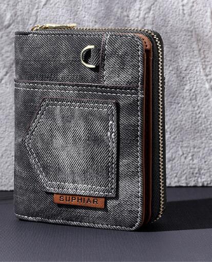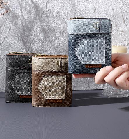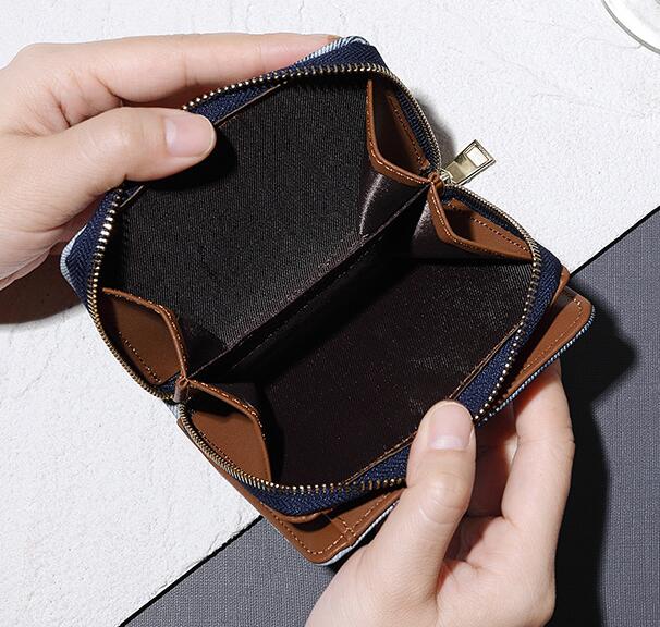 二つ折り財布でありながら薄型設計で、カードポケットと小銭入れを備えた機能的なデザイン。